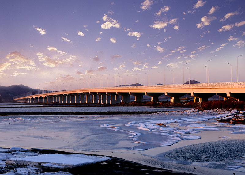 大橋工程分為主橋、預(yù)制段引橋和北側(cè)現(xiàn)澆段引橋,其中主橋長(zhǎng)500米,主跨為120米的大跨變截面預(yù)應(yīng)力混凝土連續(xù)箱梁,是當(dāng)時(shí)東北地區(qū)跨度最大的連續(xù)梁跨海橋。大橋的設(shè)計(jì)結(jié)合了使用和景觀的雙重功能,作為普灣經(jīng)濟(jì)區(qū)核心位置的地標(biāo)性景觀,獨(dú)具特色的夜景設(shè)計(jì)使其成為經(jīng)濟(jì)區(qū)一道亮麗的風(fēng)景線。